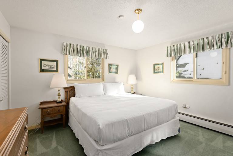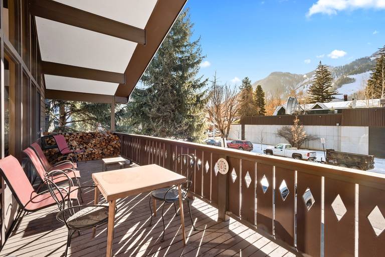 This 3-bedroom, 2-bathroom upper-level condo is part of a duplex that has a traditional ski-chalet feel with views of Aspen Mountain. It's located in a quiet residential neighborhood within walking distance to Aspen's fine dining, entertainment, and shopping. This rental features an open living area with vaulted ceilings, floor-to-ceiling windows, a wood-burning fireplace, a formal dining area, and a kitchen with a breakfast bar. Aspen Mountain provides a breathtaking view from the large picture windows on the south wall of the home and from the private deck. There is also a laundry closet in the hallway. Downtown Aspen is only minutes away, and all four ski areas are accessible by free (RFTA) skier shuttle, which stops a block from the house.