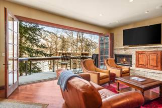 Downstairs are two additional bedrooms with en suite bathrooms, a home gym, and a laundry room. The private hot tub has stunning views of the river flowing directly toward the home, framed by aspen and cottonwood trees with Aspen Mountain towering in the distance. Guests have access to two off-street parking spaces.