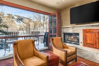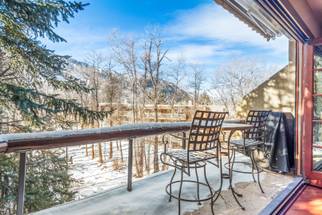 [29]This rare 3-bedroom, 3.5-bathroom luxury townhouse is located on the Roaring Fork River. It is architecturally designed to give guests a unique vantage point and incomparable views from private balconies on all three levels.