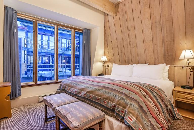 This top floor 2-bedroom, 2-bathroom condominium spans 1,000 square feet, offers great natural light, and features a wood-burning fireplace. Chateau Dumont is located in downtown Aspen, only one block from the Silver Queen Gondola. Condo amenities include a balcony overlooking the complex courtyard with views of Aspen Mountain, a dishwasher, a laundry closet, a breakfast bar, a formal dining area, and flat screen TVs. There is a wall-mounted air conditioning unit in the living room.