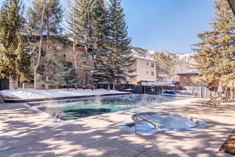 Chateau Roaring Fork's common amenities include an on-site heated pool and hot tubs, an on-site workout facility, an on-site conference room, free on-site parking, and free Wi-Fi. This complex has no elevator. The free local bus (RFTA), with access to all four ski mountains, is located right outside.
