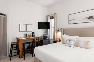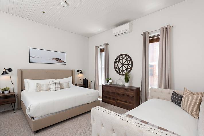 The Independence Square is a historic hotel in the heart of downtown Aspen, on the Cooper Avenue walking mall, only one block from Aspen Mountain's Silver Queen Gondola. This second-floor deluxe hotel room has a lovely corner location. Guests also enjoy air conditioning, a flat-screen TV, and a bar and receive complimentary continental breakfast. Please note this unit faces another building and does not have a view.