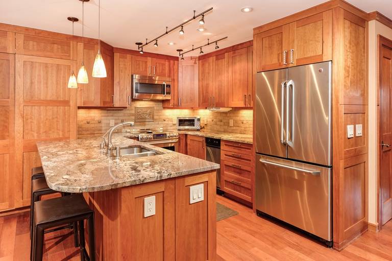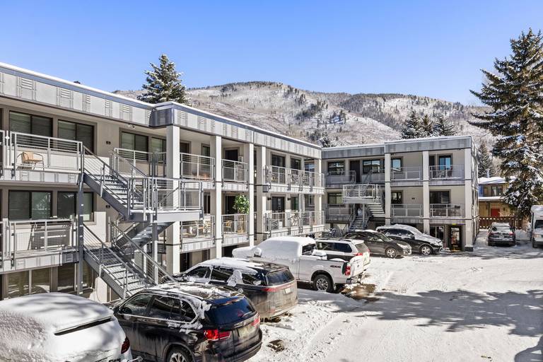 This second floor 3-bedroom, 2-bathroom deluxe condominium has a spacious, single-level layout and features many upgrades. Silverglo Condominiums are only four blocks from the Silver Queen Gondola and downtown Aspen. This expansive condo has a beautiful kitchen with stainless steel appliances and stone countertops. There's a dining area for six, and a wood-burning fireplace separates the living area. Guests enjoy the plush furniture and the private deck with outdoor seating and views of Aspen Mountain. Bedrooms have flat-screen TVs, and bathrooms have Jacuzzi tubs.