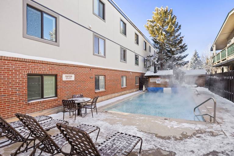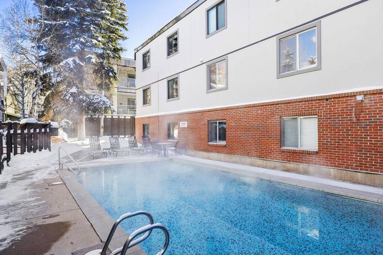 Amenities at Silverglo include a heated pool maintained at hot tub temperatures in winter, a sauna, on-site free parking, and complimentary Wi-Fi. Guests also benefit from housekeeping, concierge services, and free Aspen Airport transportation. Guests enjoy the free, on-demand skier shuttle between Silverglo and Aspen Mountain daily from 8 a.m. to 5 p.m. during ski season. For small gatherings, the Silverglo offers a cozy conference facility with a fireplace. It is perfect for group breakfasts, après-ski events, and intimate gatherings, accommodating up to 25 people. The complex has a laundry room adjacent to the conference room. Quarters are available 8 am-5 pm Monday-Friday from the onsite Front Office. Please note this property does not have an elevator.